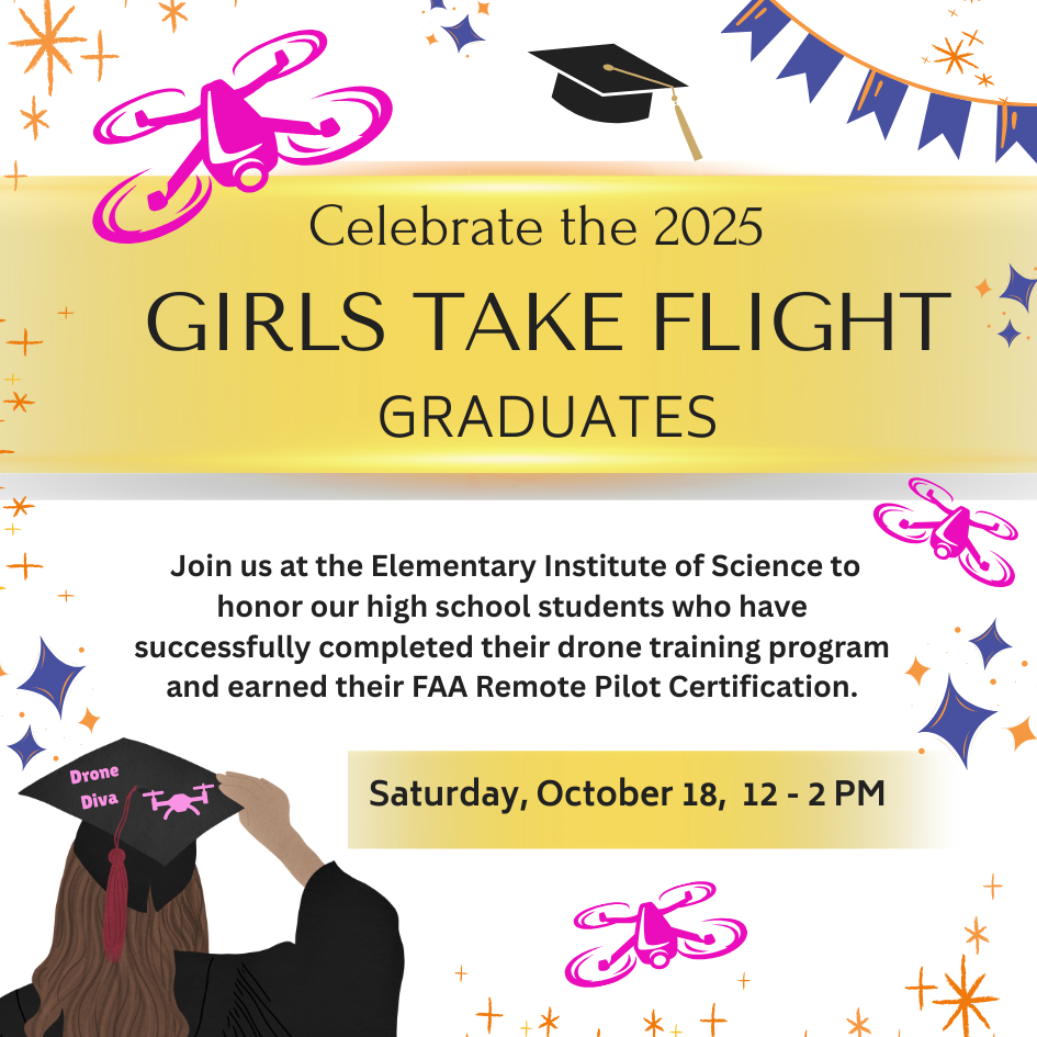 Join us at the Elementary Institute of Science on October 18 from 12 noon – 2pm as we honor the incredible achievements of our high school students who have successfully completed their drone training program and earned their FAA Remote Pilot Certification.