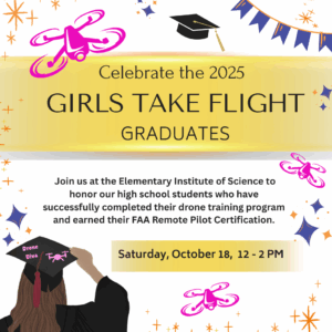 Join us at the Elementary Institute of Science on  October 18 from 12 noon – 2pm as we honor the incredible achievements of our high school students who have successfully completed their drone training program and earned their FAA Remote Pilot Certification. This is a special moment to celebrate their hard work, dedication, and bright futures in STEM. Come be a part of this milestone event and show your support for these talented young women as they soar to new heights! We look forward to seeing you here! CLICK HERE TO RSVP